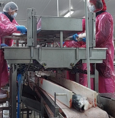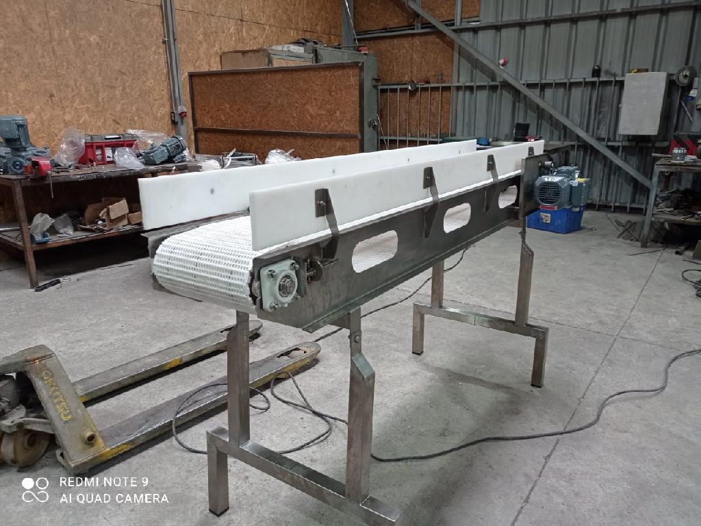 Módulo de línea de montaje para productos orientados a la pesca como lo son piezas de pescado entre otros, estructura de acero cromado y patas nivelables.